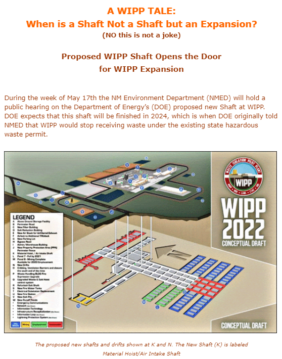 During the week of May 17th, the NM Environment Department (NMED) will hold a public hearing on the Department of Energy’s (DOE) proposed new Shaft at WIPP. DOE expects that this shaft will be finished in 2024, which is when DOE originally told NMED that WIPP would stop receiving waste under the existing state hazardous waste permit. The shaft is clearly an essential part of DOE's long-range plans, to expand WIPP—currently the only nuclear waste repository in the nation—and to operate it for decades.