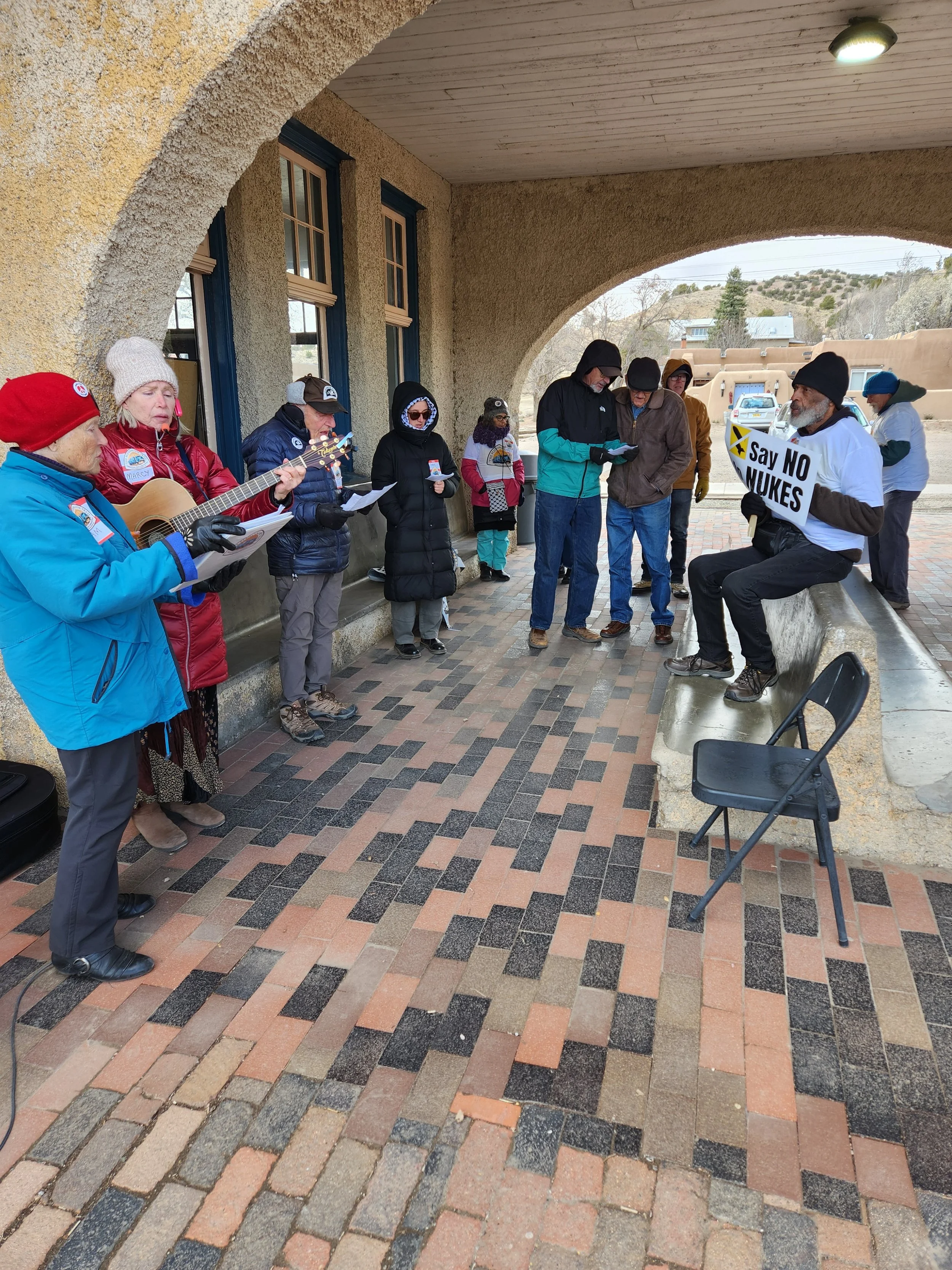 Also a bravo to Chris Harrell for music both at the Farmers’ Market and at Lamy that kept people’s toes tapping as they sang along to familiar songs with new nuclear protest verses.