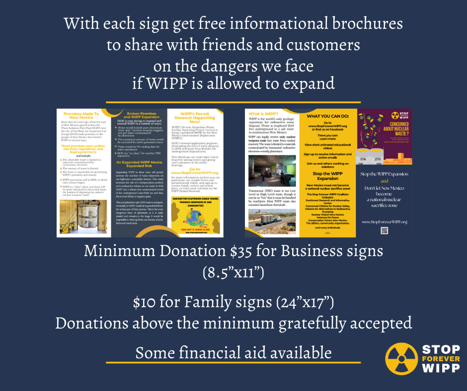 Consider making a fully tax-deductible donation to help us to continue to raise awareness, reach wider audiences, protect our communities from nuclear waste and radiation, and most importantly, STOP FOREVER WIPP.